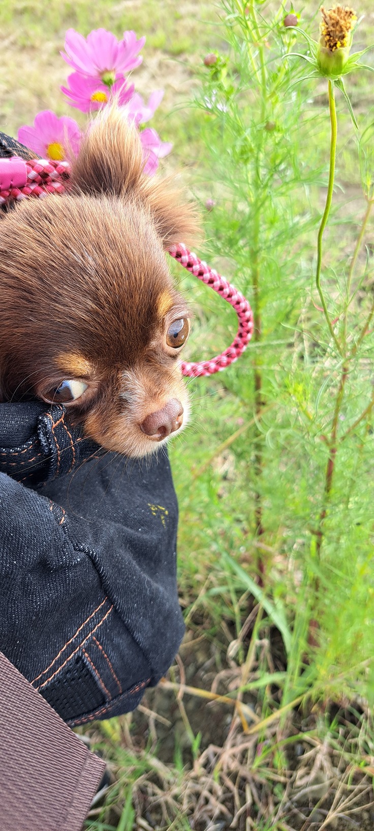 バックに入ってお散歩です。庭先でリードをつけて下ろしても、プルプル震えて座り込んでしまいます(感染症のこともあるため、敷地外では下ろしていません)。