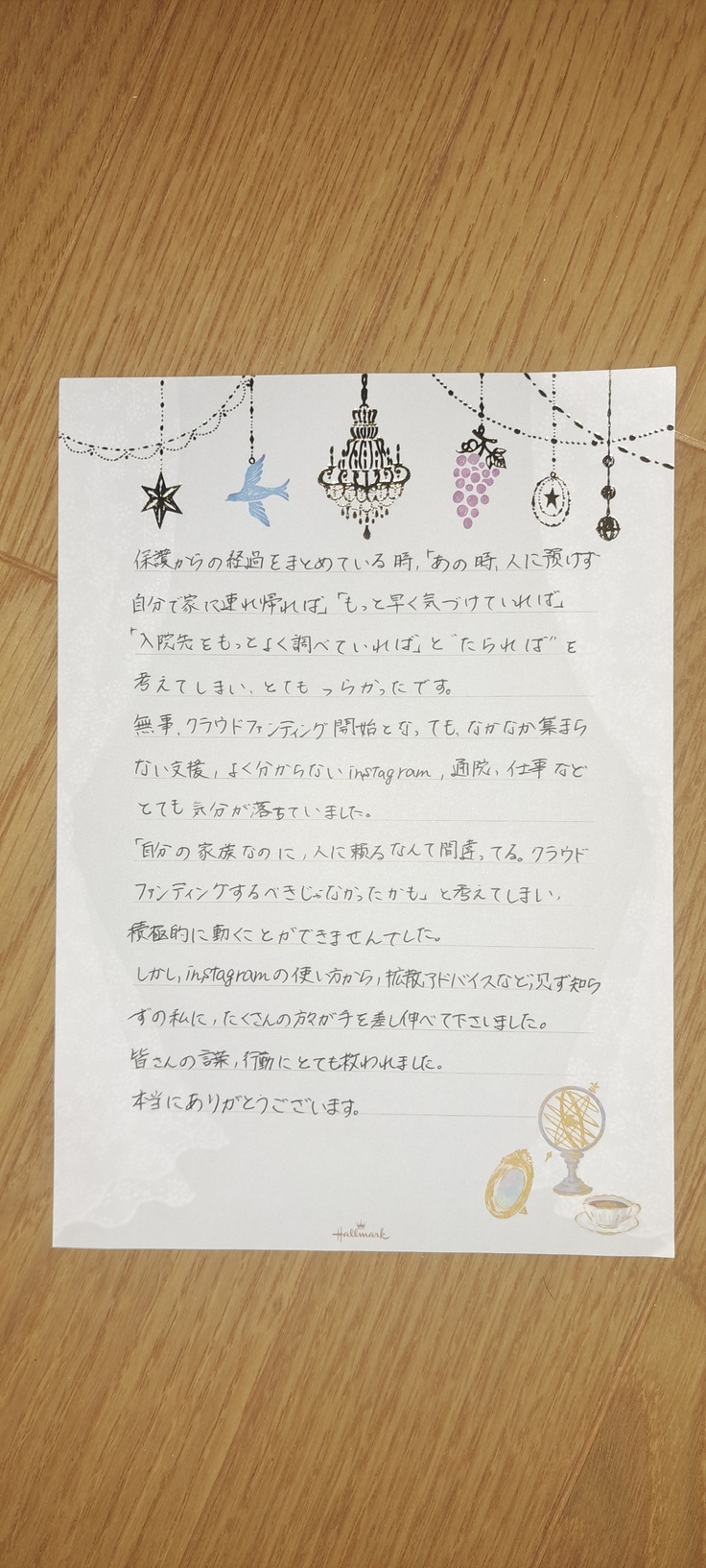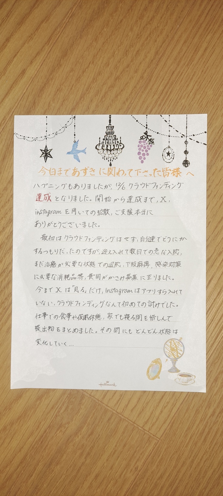 前回の活動報告に記載した件について、支援者様とのやり取りの結果、会社側がキャンセルせず、私(実行者)から返金対応となった場合は返金不要との結果に至りました。