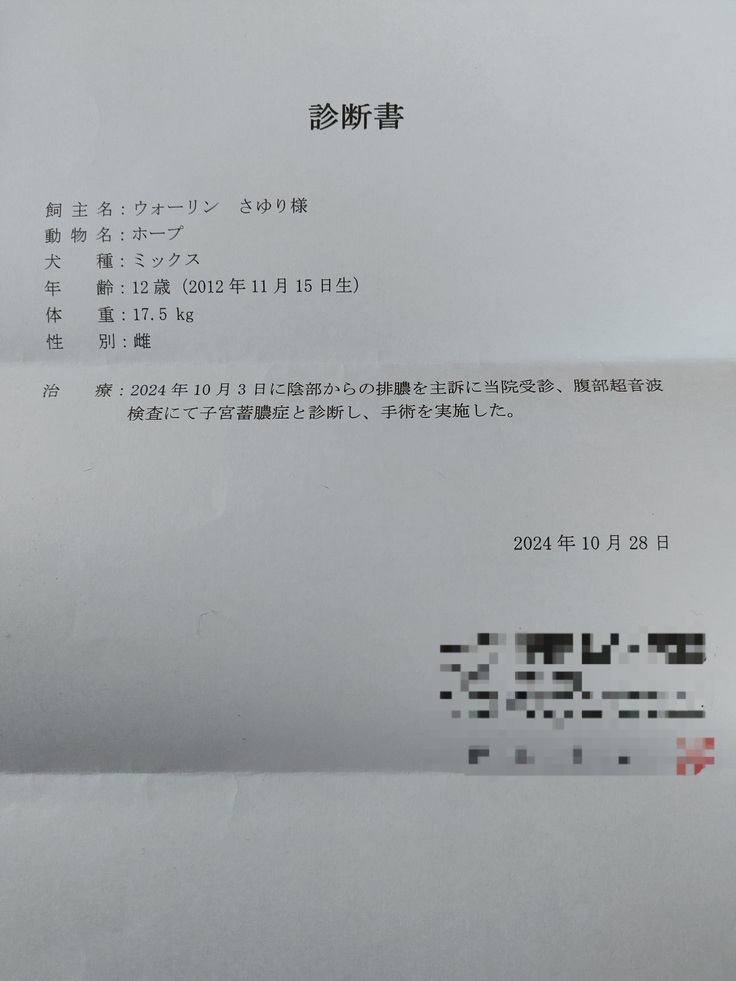 しかし今度は子宮蓄膿症と診断が出てしまい、早急に手術が必要になりました。