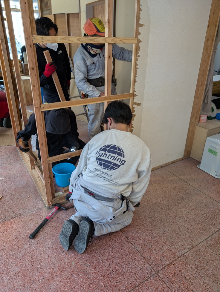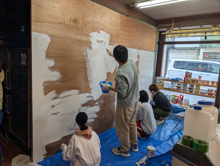 つなぎ工房内の古いものなどを片付け、壁を壊し、ペンキで白く塗り、数回の作業を経て