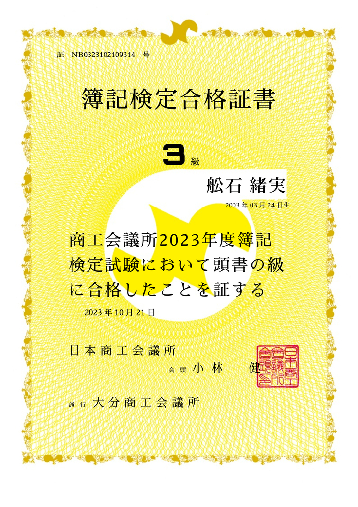 プロフィールをご覧いただきありがとうございます。 氏名 舩石緒実(フナイシツグミ) 年齢 21歳 職業 大学生。 自分に自信がない人を勇気付けるため、自分でも何かを成し遂げられると証明するために現在公認会計士を目指しております。 実績として過去に簿記2級の取得、TOEIC800点、英検順一級の合格を達成することができました。