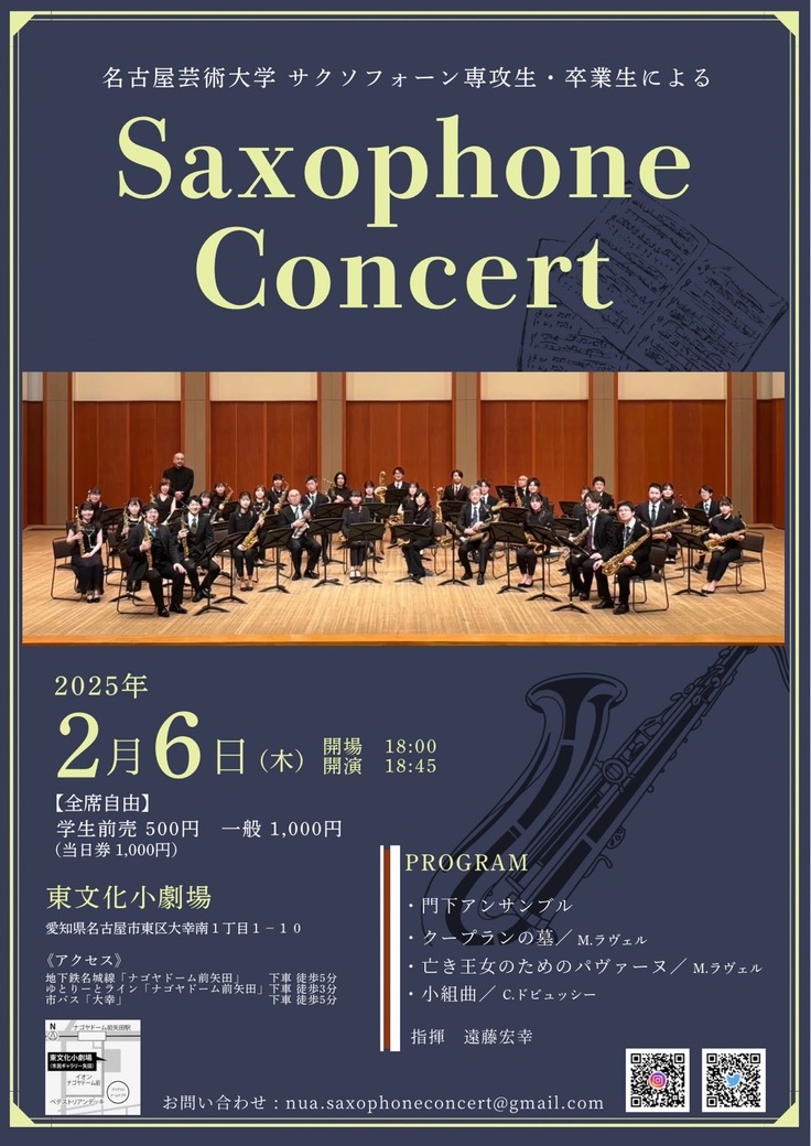 名古屋芸術大学のサクソフォン専攻生・卒業生によるサクソフォンのみの演奏会となっております。