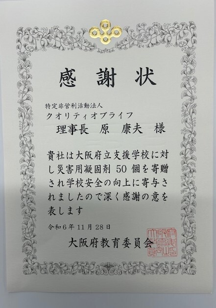 11/28(木曜日)に大阪府の教育委員会にトイレ凝固剤50セットを寄付致しました.