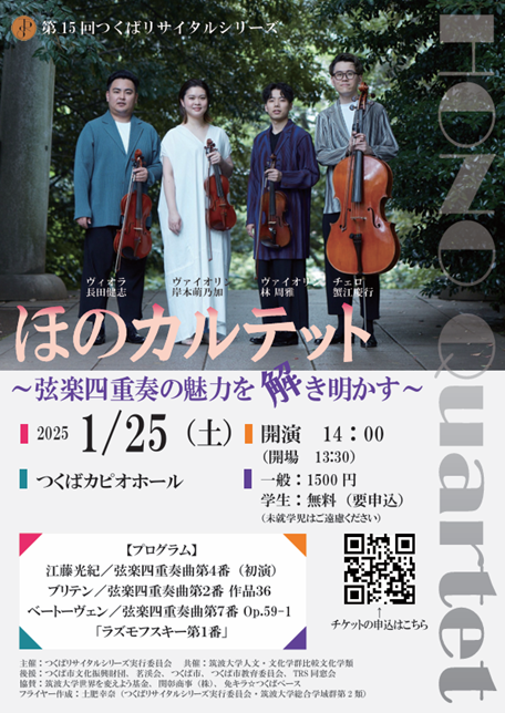 つくばリサイタルシリーズ実行委員会がつくばカピオ・ホールにて、ほのカルテットを招待したクラシックコンサートである「第15回つくばリサイタルシリーズ」を開催する。