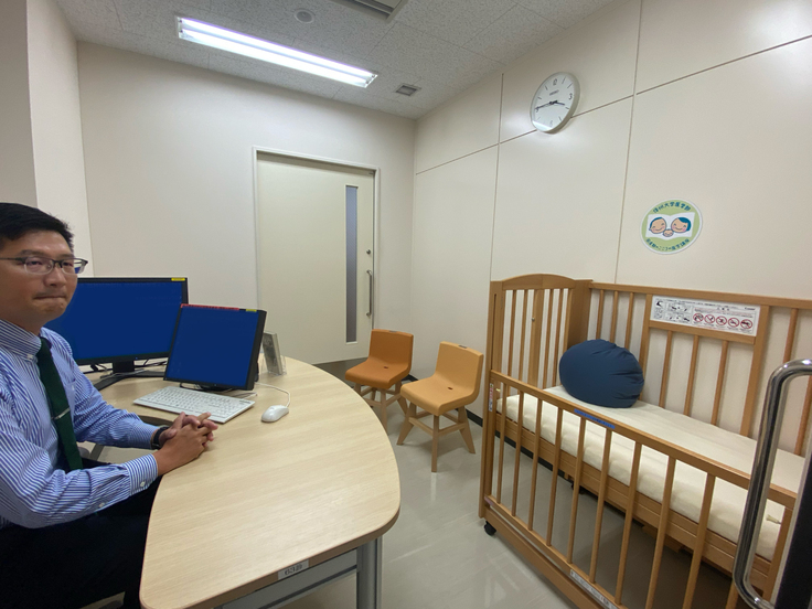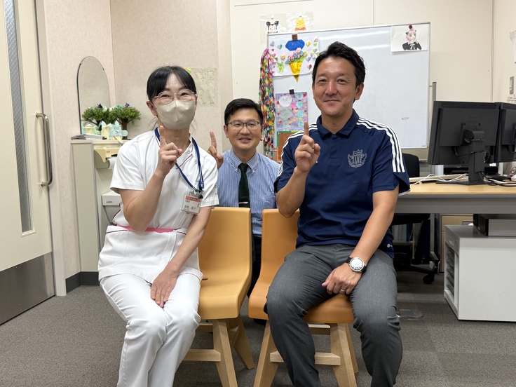 早速、担当の村上先生の外来に椅子を設置してくれました。近くにいらっしゃった医師・看護師も見にきてくださり、「椅子の色味が部屋にマッチしているし、外来のママさんたちにも喜んでもらえるね」などのお声をいただきました。