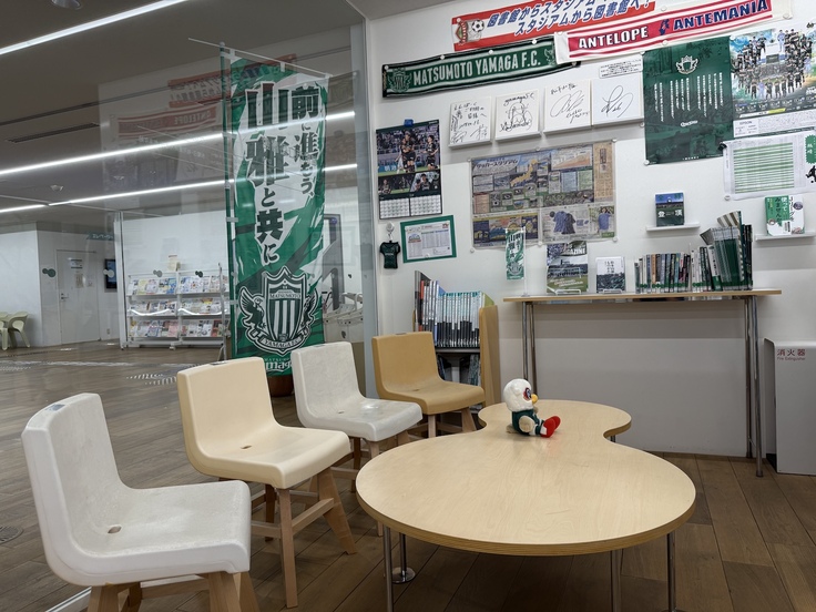 コーナーには、山雅の歴史を知ることができる書籍や懐かしい資料がたくさん置かれており、ご来館者の方に気軽に手に取っていただけますので、ぜひアップサイクルチェアに座りながらご覧ください。