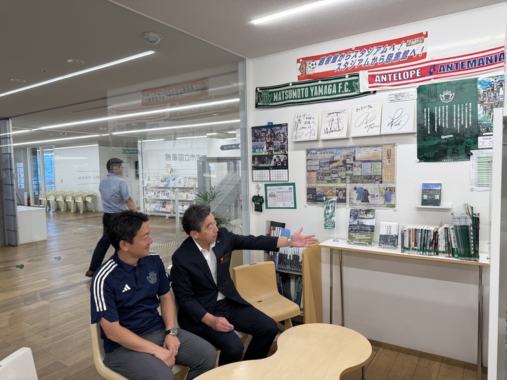寄贈式終了後には、百瀬 敬 塩尻市長と小澤社長がコーナー置かれた椅子に腰掛け、懐かしい資料を手に取りながら試合の話で盛り上がり、最後はJリーグ終盤戦に臨むトップチームに対しての激励もいただきました。