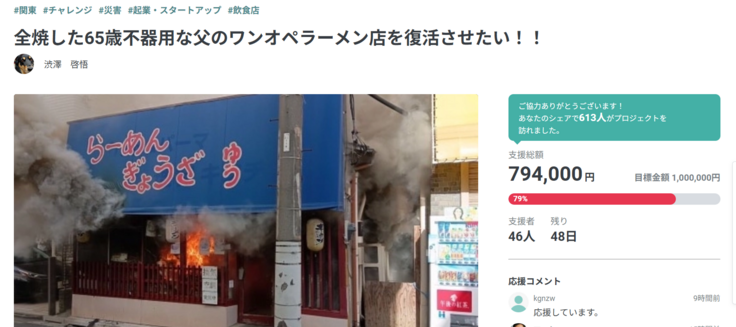 目標の100万円まであと少し。ラーメン店再建に向けて、
