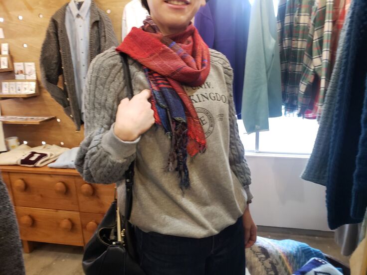今回は返礼品にはありませんが、ロングマフラーの赤です。日本色の赤なので落ち着いた感じです。