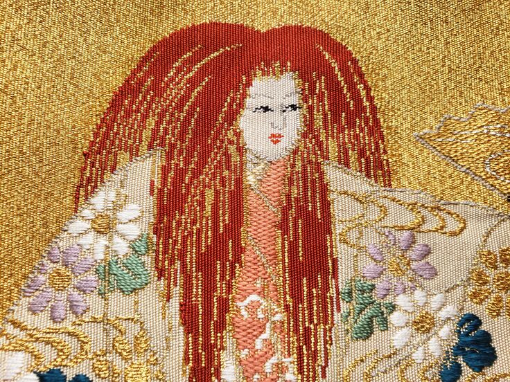 和の布地は多種あります。つづれ織りは刺繍ではなく、織ることによって、図柄(絵)を作り出しています。日本刺繍は非常に細い糸で作成するので、高級品は近くで見ても織り込んでいるように見えますが、実際さわるとつづれ織りはフラット(平面)です。そのため、耐久性もあります。なかなか、画像ではお伝えできないので、拡大してみました。