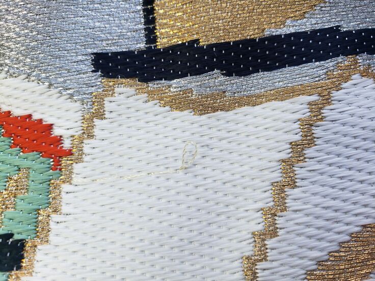 A2つづれ織りの模様はすべて刺繍や染めではなく、織り込んでおりますし、非常に織が細かい上に糸も強いので(元はタペストリーですから)、多少の雨にあたってもシミにはなりませんし、小さなほつれも糸を切ってもそこから穴が開くことはありません。また、持ちてもつづれ織りですので、丈夫です。使っているとほつれは出できますが、ご安心を。小さなほつれの画像です。