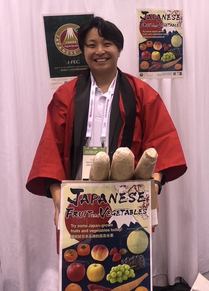 社会人になってからは、より農業について学ぶため株式会社日本農業へ入社しました。ここでは、ベジタブル事業部にて、耕作放棄地の獲得に向けた地権者交渉からサツマイモ栽培までの事業の立ち上げに携わりました。また、営業も担当させていただき、初年度は3000万円だった売上を2年目には4億円まで成長させることができました。その後は、営業部長として会社の売上を伸ばしつつ、選果場の製造部長も兼務し、50名のパートが勤務する現場の統括や、農産物の生産・製造・販売において多くの経験を積ませていただきました。上の写真はアメリカ・シカゴでの輸出展示会にて、長芋の販売をしている姿です。大変なこともたくさんありましたが、とにかく人に恵まれ、社会人として大きく成長できた経験となりました。ここでの経験から自分自身の手でもっと農業という分野を盛り上げていきたいと強く思うようになりました。
