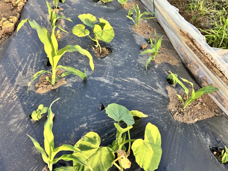 これは、かぼちゃ・とうもろこし・いんげんを一緒に植えることで、互いに助け合いながら育つ栽培方法です。
