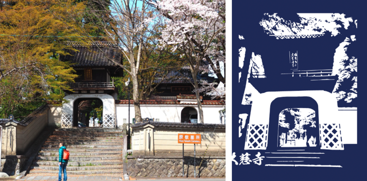 製作する観光グッズとさせていただいたデザインは、鉈屋町の観光スポットの1つである「大慈寺」のイラストを取り入れたものです。この「大慈寺」は、南部盛岡藩の南の寺院群の1つであり、第19代内閣総理大臣である原敬の墓所があるお寺で、珍しい中国様式の山門が特徴となっています。