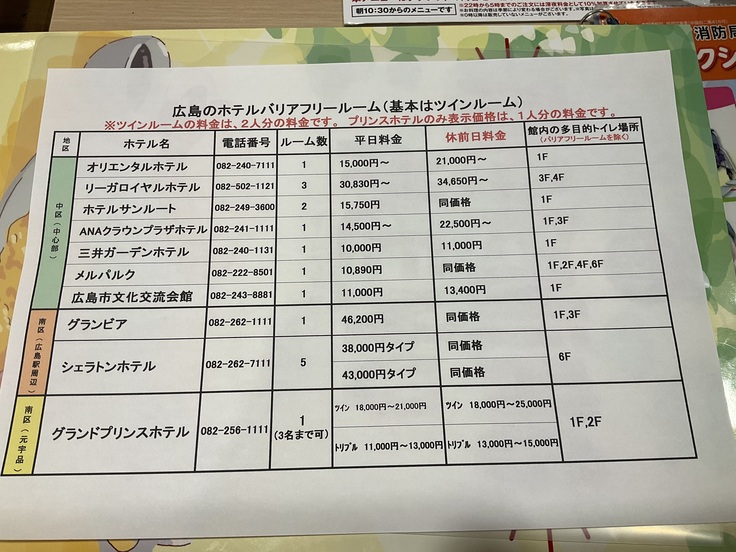 上記の一覧表は数年前に、私自身で調べた広島市内のバリアフリールーム(ハンディーキャップルーム)になります。