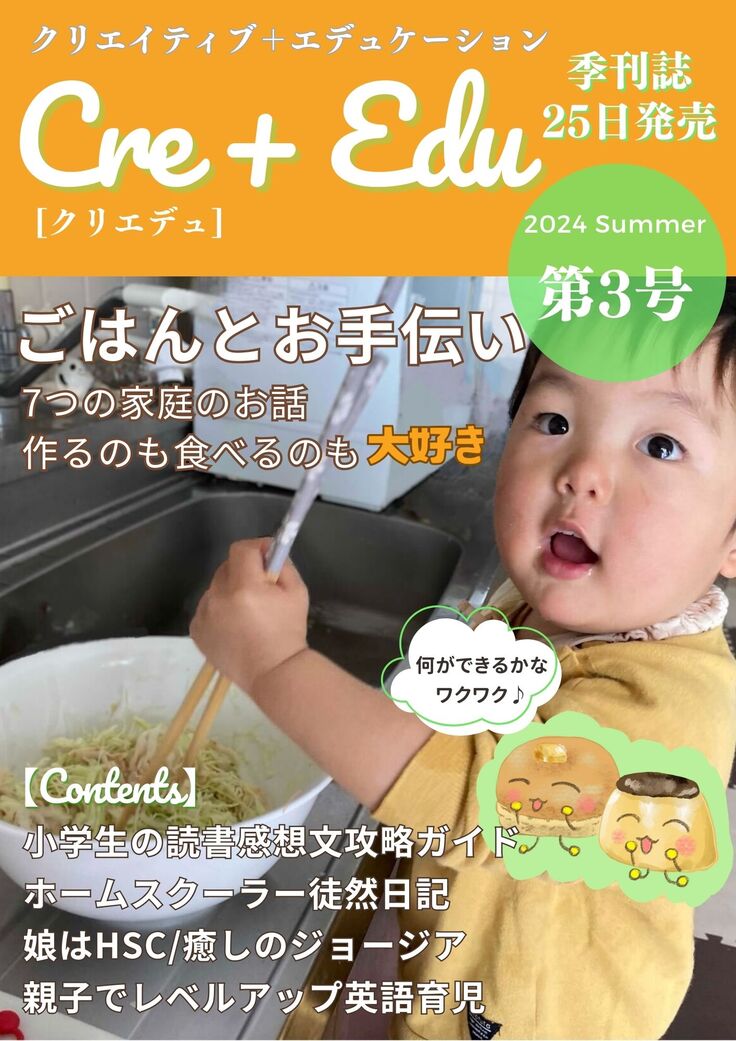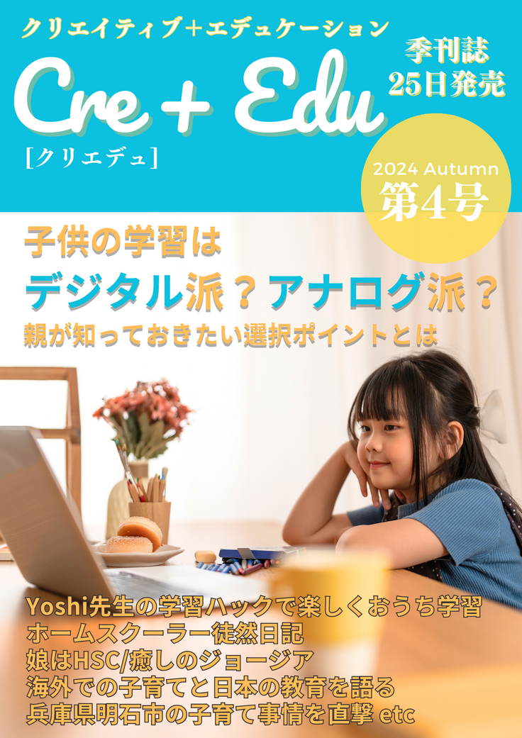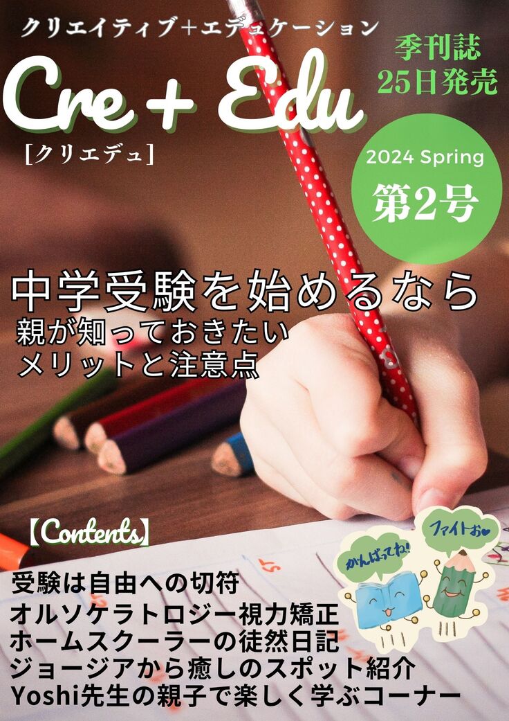 私たちの季刊誌「Cre+Edu(クリエデュ)」は、子どもたち一人ひとりの個性に寄り添い、最適な環境を整えるために、親ができることを探求し、挑戦する内容をお届けしています。この名前には「Creative(クリエイティブ)」と「Education(教育)」という二つの言葉が込められており、これらを融合させることで、多様な学びの情報を発信しています。 また「クリエデュ」では、子育てにおける新しい視点やアイデアを提供し、親たちが自信を持って子どもたちの成長をサポートできるようにすることを目指しています。