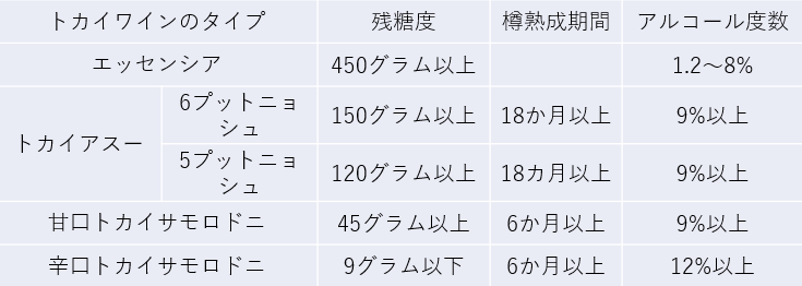トカイワインには、表で示したように、造り方によってエッセンシア、アスー、サモロドニという3つのタイプがあります。