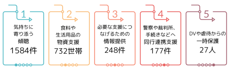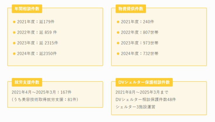 年間相談件数は増加し、物資提供数は減るもののシェルター相談は増加しています。