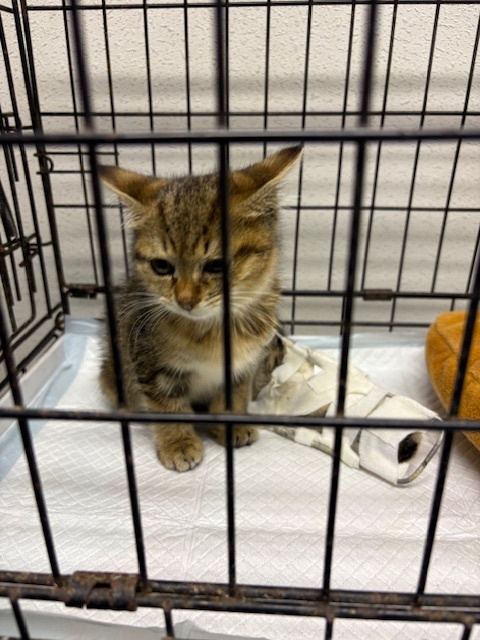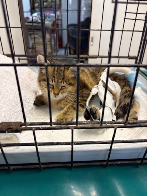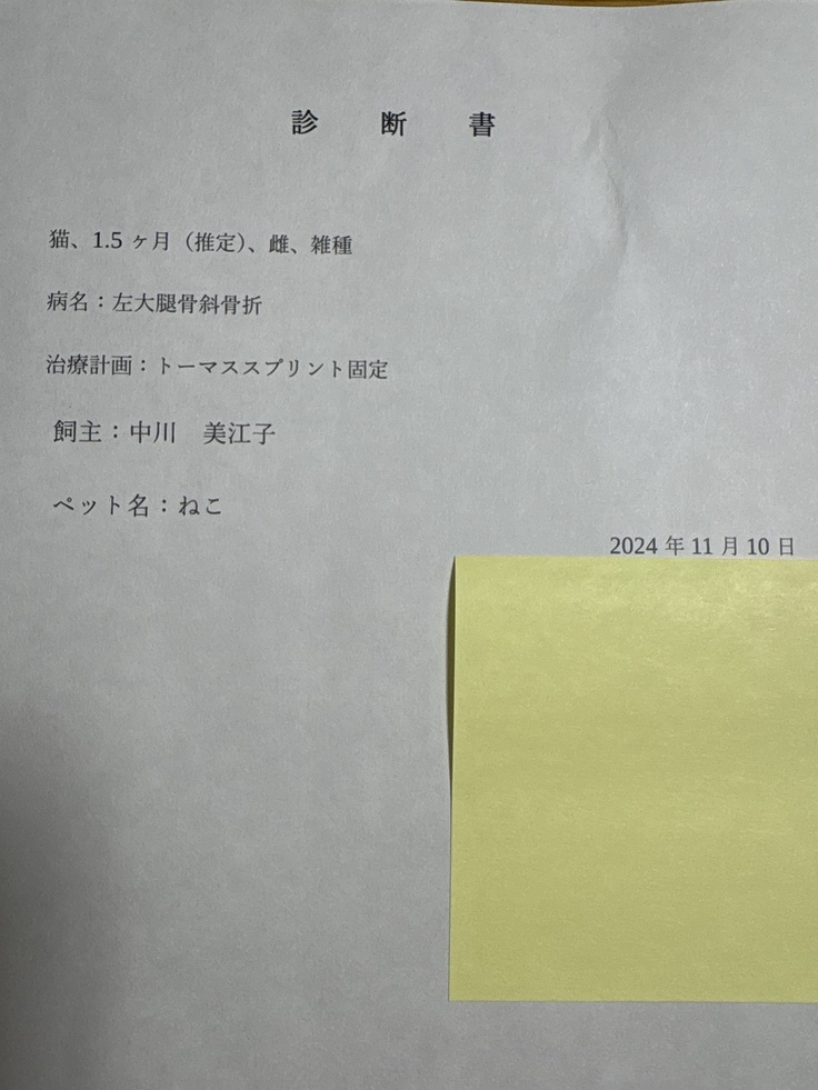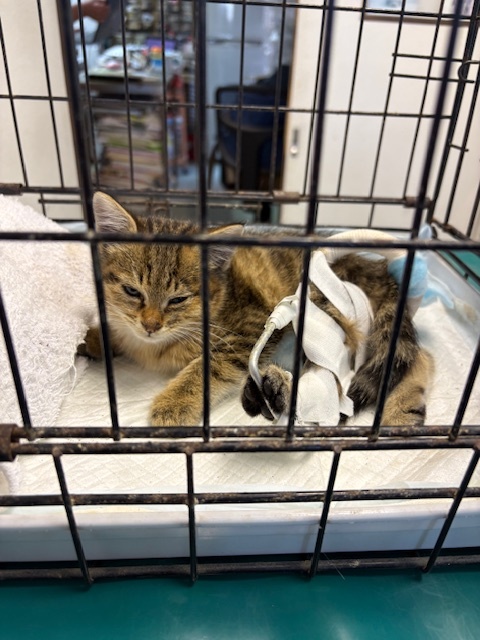 子猫は翌日の検査で大腿骨骨折、血尿、眼の炎症と分かりました。