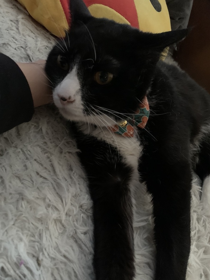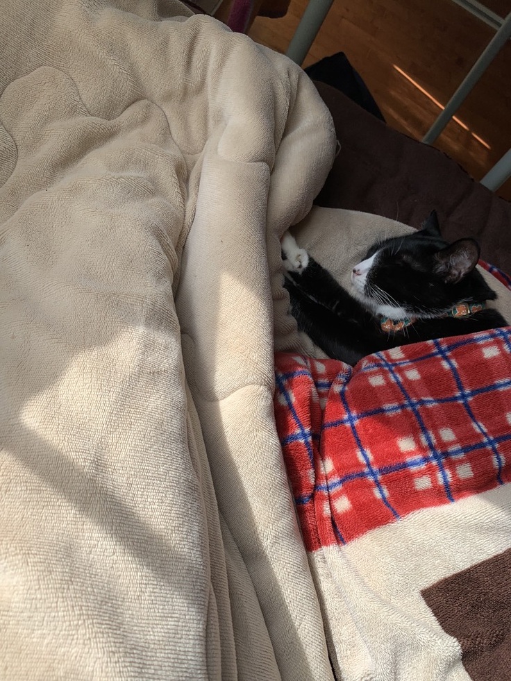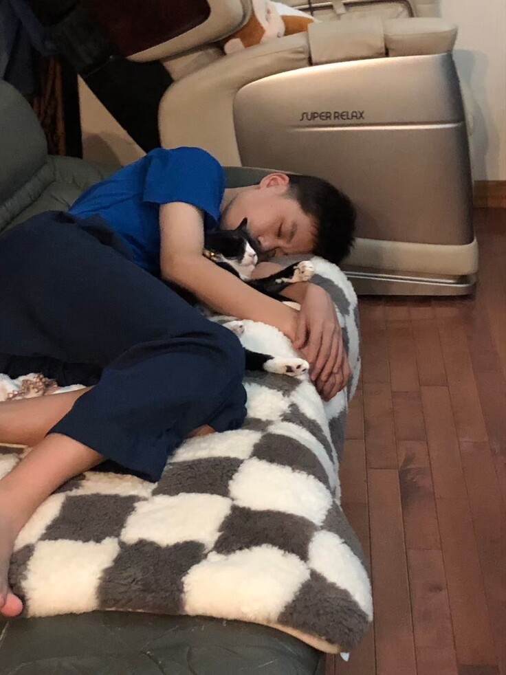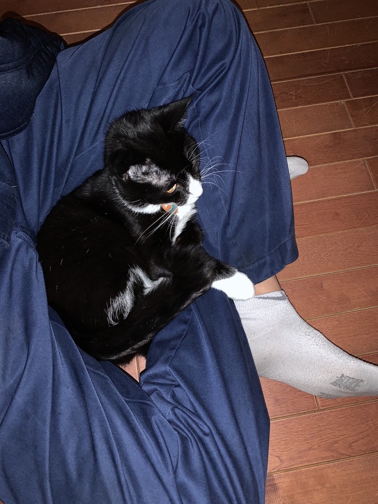 (家に帰ったら膝に乗ってきたとろろの写真)(仕事で疲れてとろろと昼寝した写真)