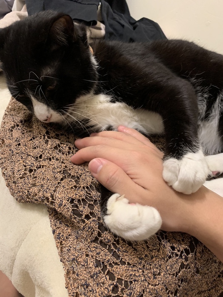 (とろろが心配で隣にいたら手を握ってくれた写真)