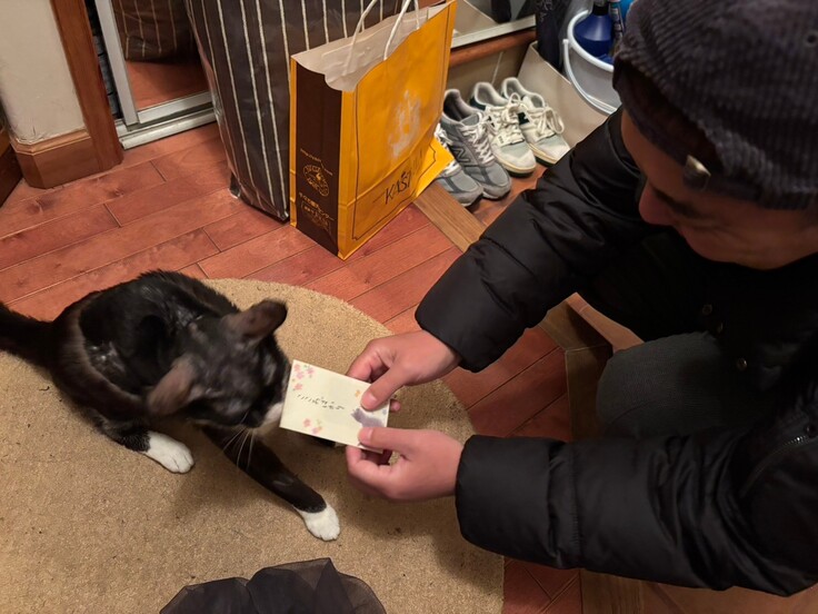 ですが玄関の扉を開けると待ち伏せをしていたとろろが真っ先に田崎さんのもとへ初めましてと言いにいきました。