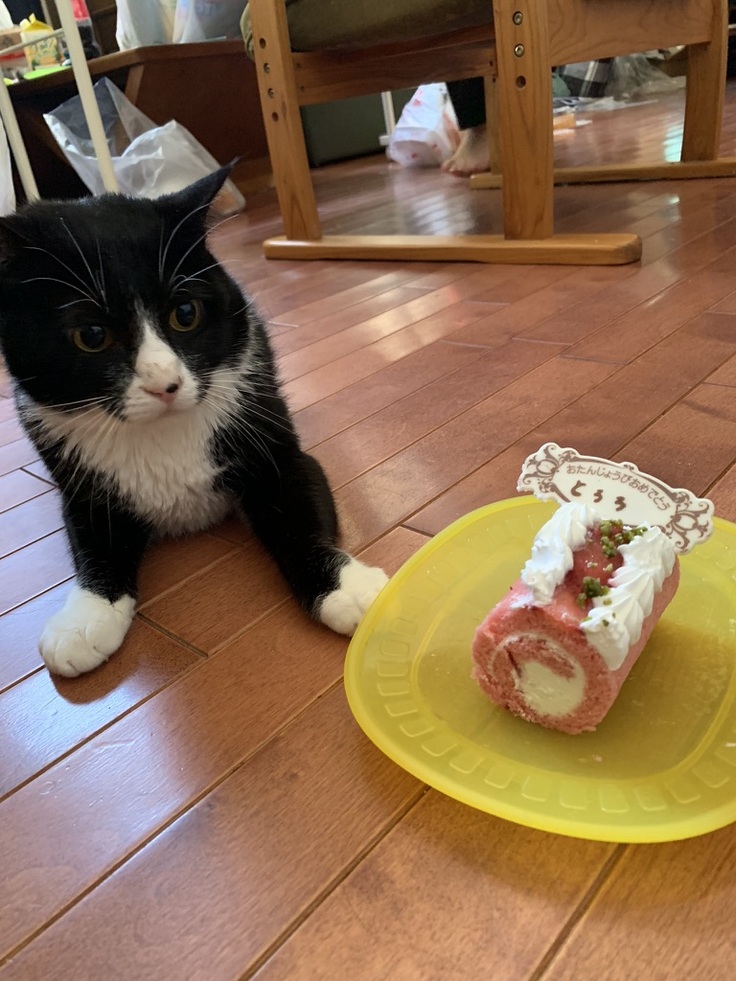 (とろろを保護してから1年の記念日にケーキをあげた写真)