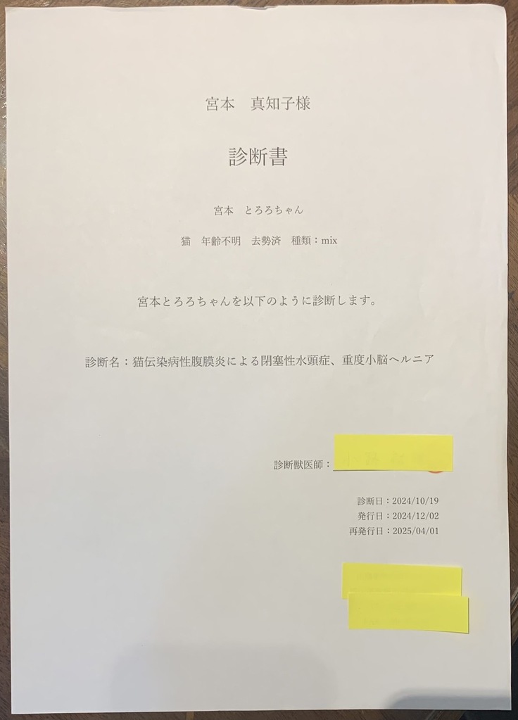 再度病院へいき、MRIなどの精密検査を受けると、FIPだと判明しました。
