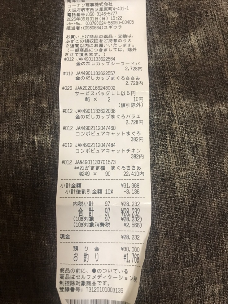 今回購入した領収書と残金です。