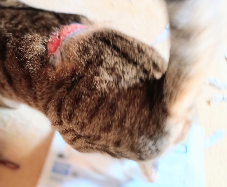 事故の原因は、思い返せばある日CATタワーの円形台の部分のネジの緩みで落下していた事が有り、たぶんその時に金属部分がたまちゃんの背中に命中したのだと思われます。保護主の落ち度です。皆様も時々猫遊具、寝台等チェックし、安全対策を怠らない様にしましょう!