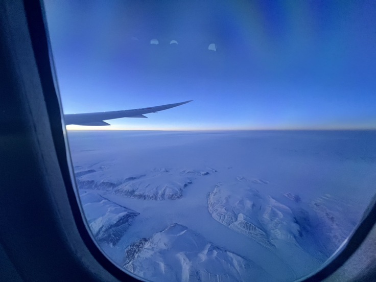 (北回りの航路ということで、恐らくグリーンランド?の上空を飛び、飛行機窓横に見える壮大な雪の大地に圧倒...)