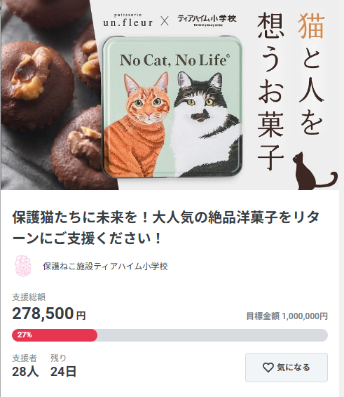 元旦からスタートしたクラファンプロジェクトですが、すでに28名の猫を愛する皆様にご支援いただいて、現在目標金額の27%を達成しております!