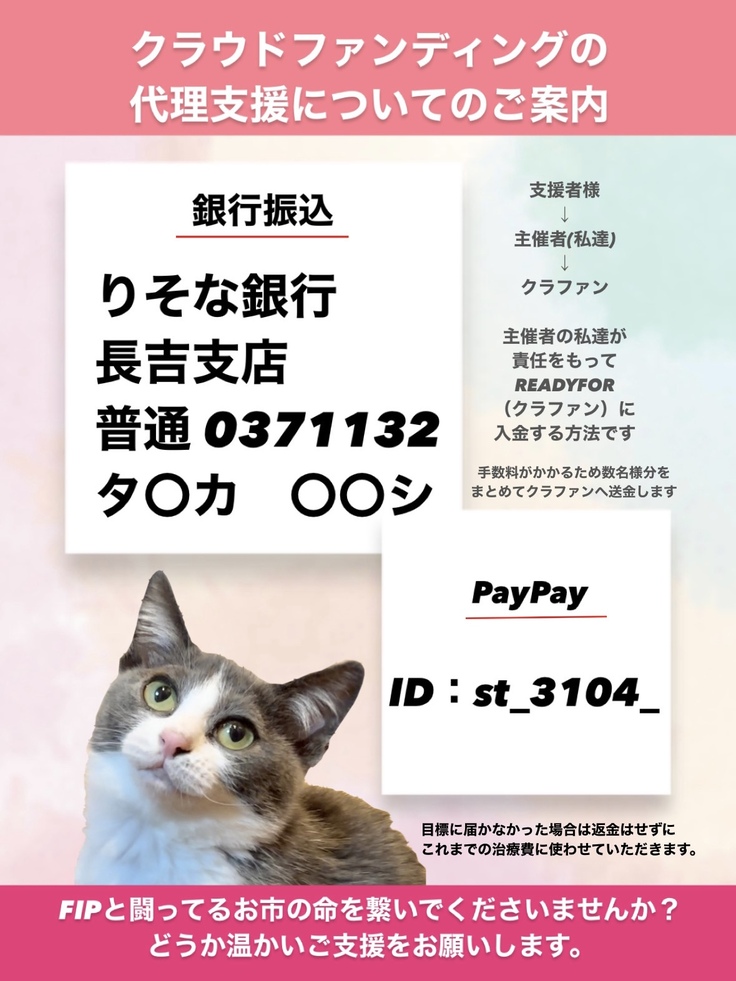 猫伝染性腹膜炎を患ったポンちゃんの明日をつないで頂けないでしょうか