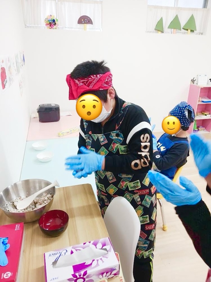 そして、白飯にふりかけを混ぜ込んでラップを使っておにぎりを作りました。