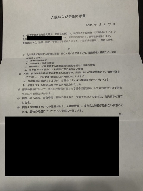 まだ、首、左脇腹、右後脚に糸が付いているため、3月7日(金)に抜糸と、術後2週間検診に行きます。