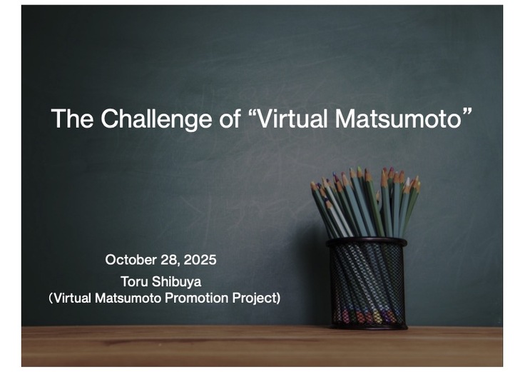 昨晩ですが、JICAさんから機会を頂き、ウクライナの教育・学生約300名の方々に対して「ばーちゃるまつもと」の紹介を行いました。こちらかの資料共有やデモができなくなったりトラブルはありましたが、無事完了いたしました。本プロジェクトの取り組みも紹介させていただきました。