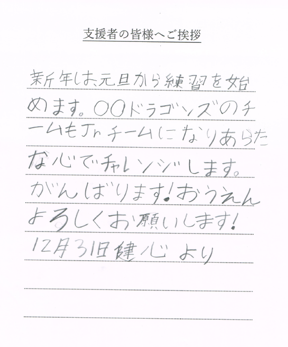 支援者には、私からの感謝をお伝えするとともに子供の直筆の手紙(メールに添付)を添えたいと思います。