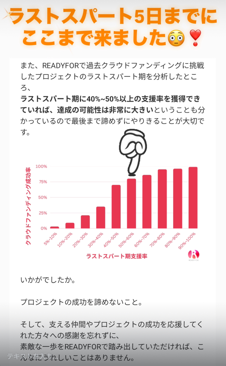 READYFOR担当者さんいわく、終了5日前を『ラストスパート期』というそうですが、それまでに目標達成率75%(150万)まできていれば、かなりの確率で目標が達成されるそうです。
