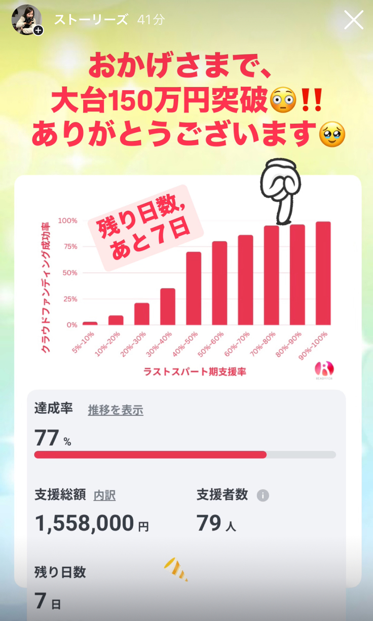 プロジェクトへの想いや感謝を伝えるチャンスもあと7日。なんだか少し、寂しいような、早く達成して終わりたいような、、何とも言えない心境にあります😌