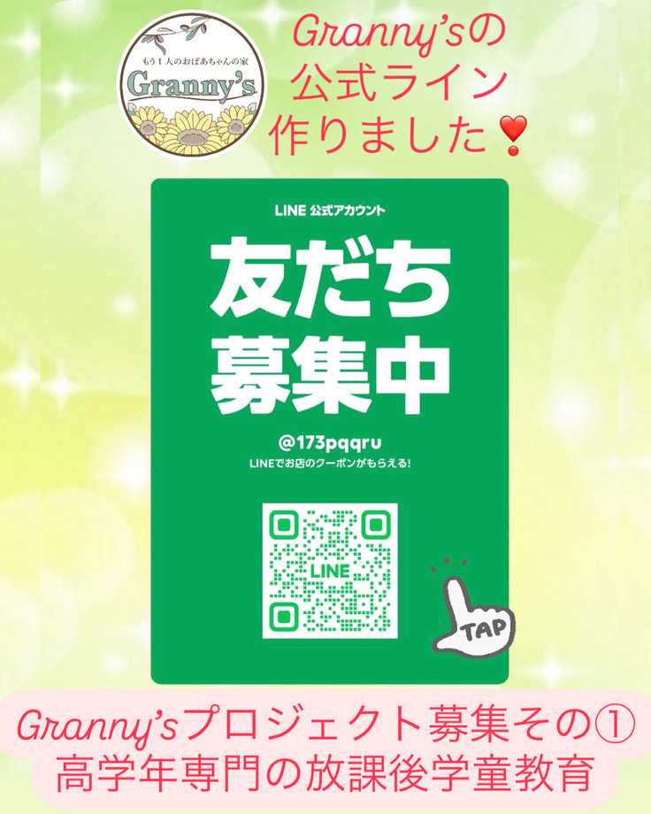 下記のGranny’sプロジェクトの中で、何か1つでも心惹かれるものがありましたら、子どもだけの預かりでも、親子での参加でも、大人だけの運営側でも、どなたでも気軽に公式ラインにて承ります❣️どうぞよろしくお願いいたします☺️