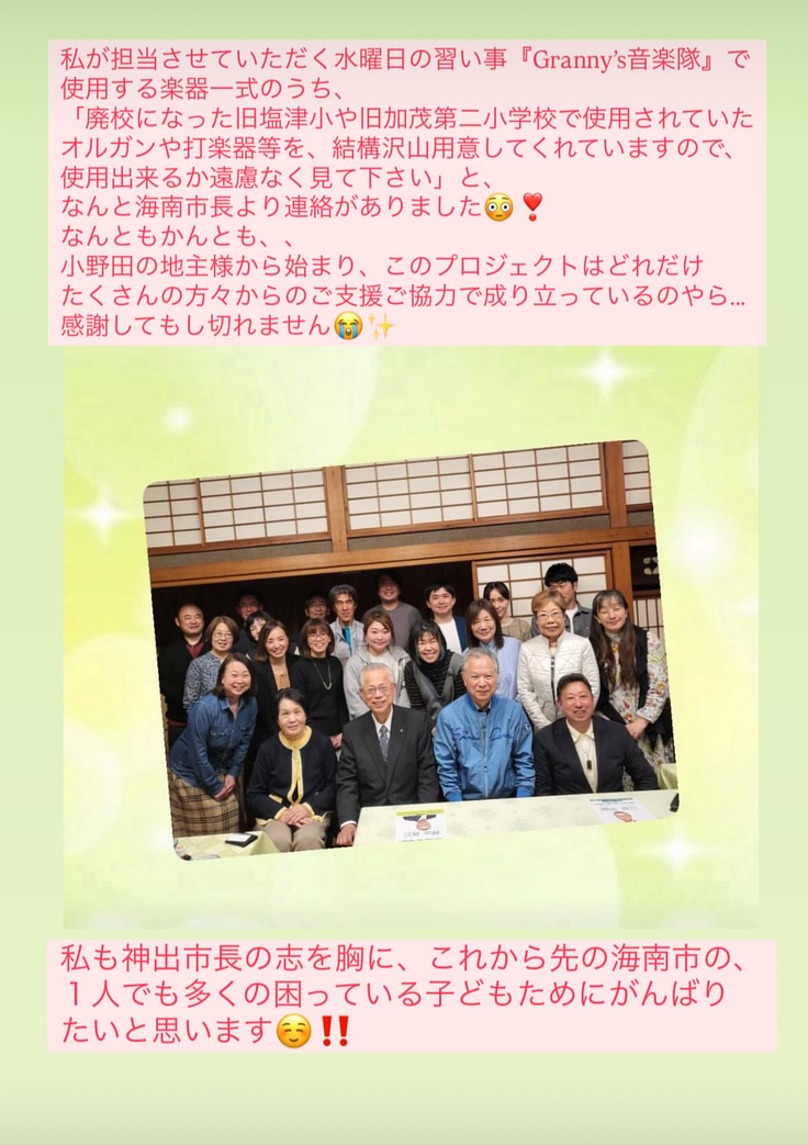 そして来月からは、いよいよ海南市長からのご厚意で、旧塩津小学校と旧加茂第二小学校の余っている楽器の選定をさせて頂く予定です❣️
