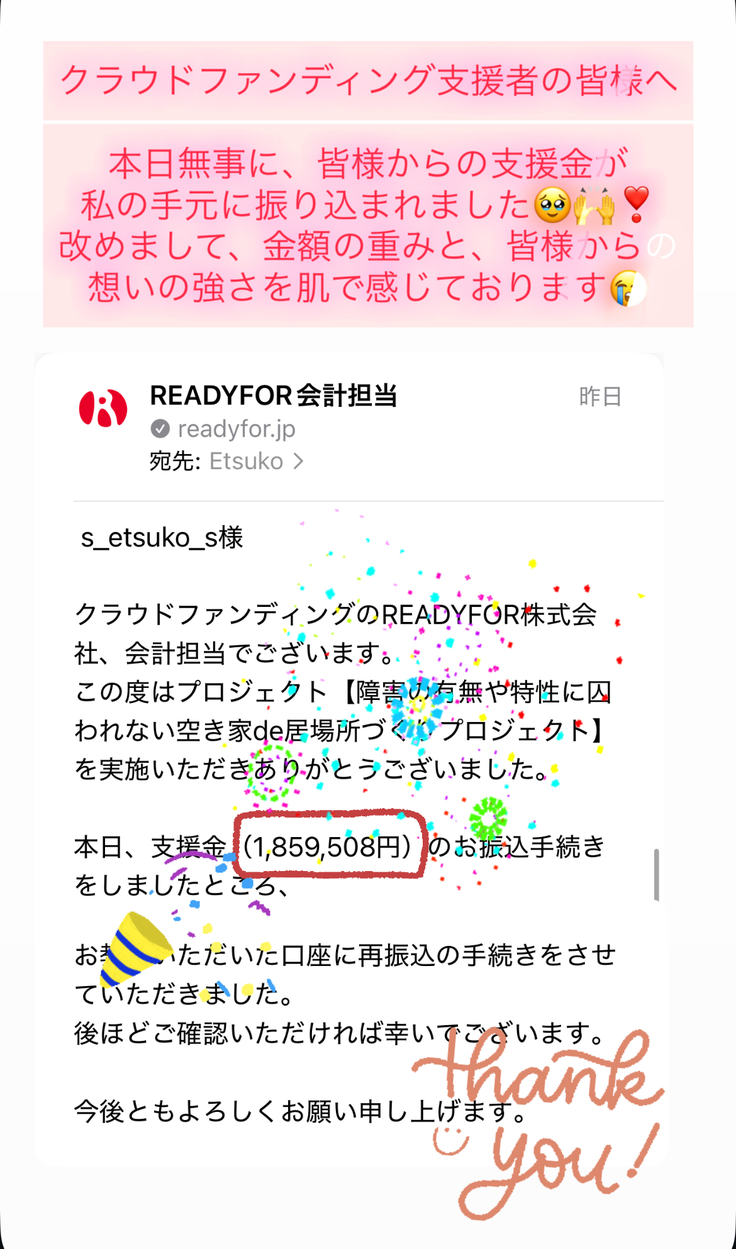 この度、ついに皆様からいただきました支援金が、私の手元に無事振り込まれましたので、ご報告させていただきたいと思います🥹