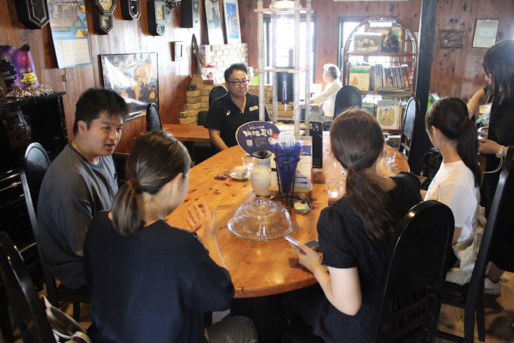 ↑ 飲食店を経営されている岩﨑さんと、元地域おこし協力隊の中下さんにインタビューをしている様子です。