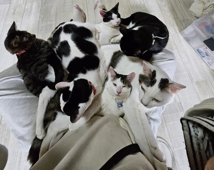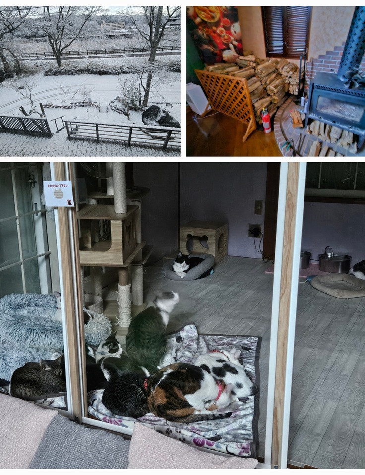 猫の城だけはエアコンと空気清浄機で管理しているのでみんなくつろぎタイム…私も寒さに耐えきれず避難する事も…あっと言う間に猫団子
