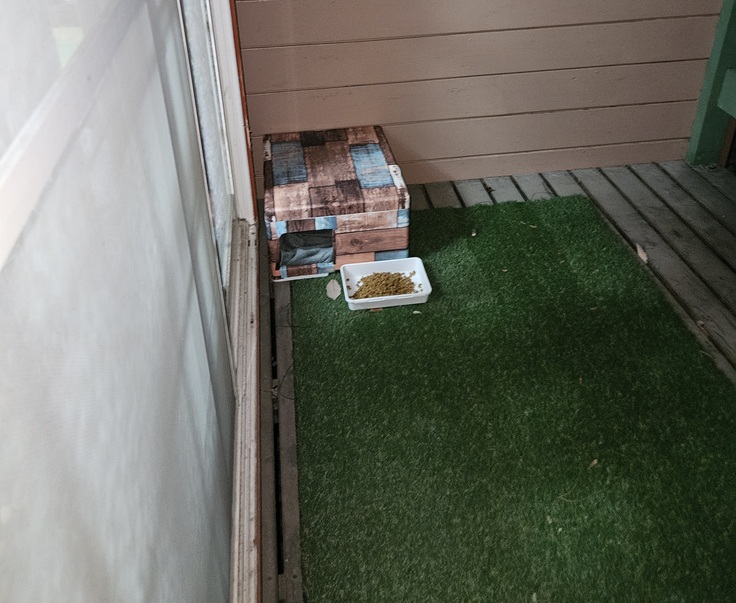 猫の城のお部屋の横のウッドデッキに外🐱たちように毎日ご飯を置いてあります。