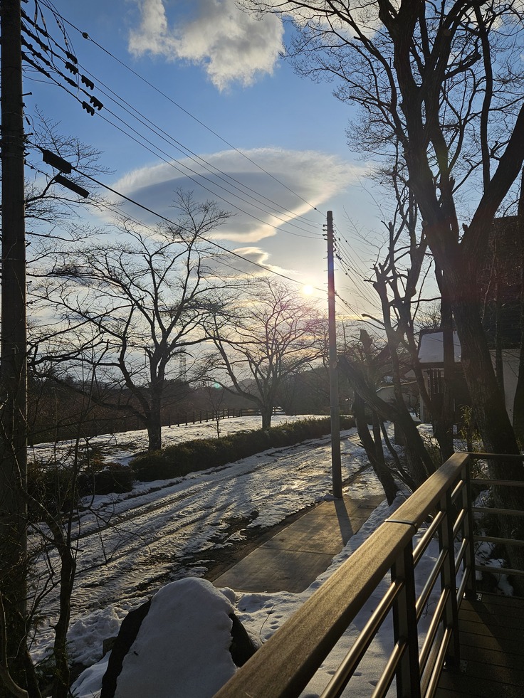道路や庭にはまだ雪が残っている。駐車場は雪かきのおかげで…