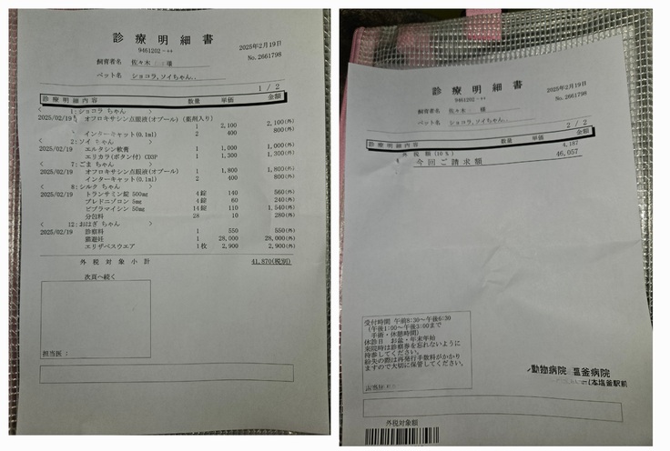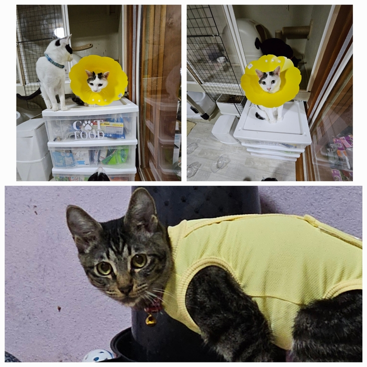 病院での検査の結果おはぎちゃん無事に手術受けられます。既に10:30急いで仙台の病院へ私の診察があるので…1時間後到着。おはぎちゃんのお迎えまでの間に受診、仕入れと今日もバタバタ忙しい…。病院へお迎え、先生から身体が小さい為卵管がかなり細く大変だったと…確かに見せて頂いた時1番小さい…。その分負担も大きかった…しっかり経過観察していきます。みんなのお薬とソイくんはエリザベスカラーも…