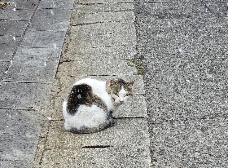 雪の中こちらを向いて丸まっていました。直ぐ側に猫小屋があるのですが…