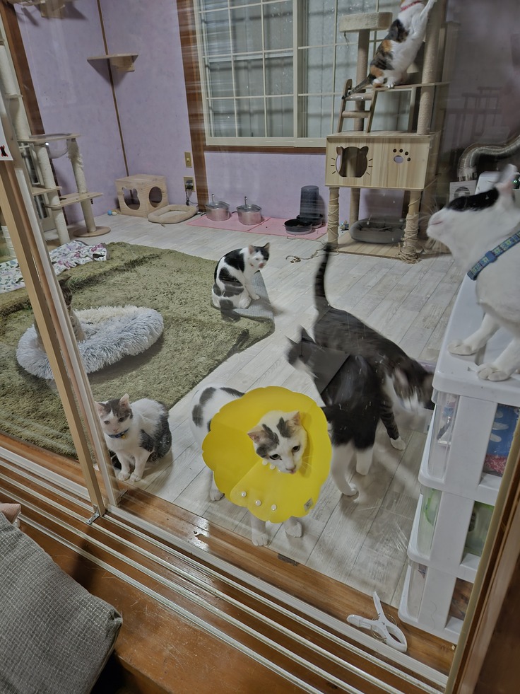 待ちくたびれている様子…ごめんね…ご飯、お薬、お掃除…ウッドデッキの外猫さんのご飯も減っていたので交換しました。