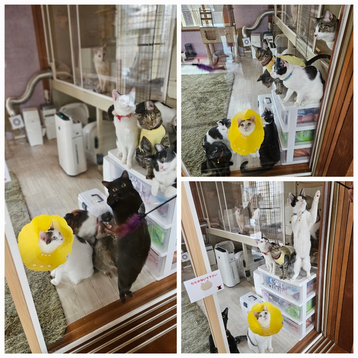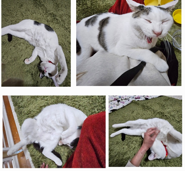 ソイくん一緒にいる間カラーを外してお膝で大あくび…。おもちくんとこまちちゃんは直ぐに撫でてのポーズ…手のひらに余るほどの小さかったこの子たち本当に大きくなったね…。おもちくんとこまちちゃんは保護時へその緒がついたままでした。こまちちゃんは心臓に問題を抱えている🐱それでもスクスク成長…。生後半年の時に突然目を開けたまま硬直、心停止…心臓マッサージ…意識が戻るも、直ぐにまた硬直3度目でやっと…私もただただ夢中でした。前回受診の時にも心臓が少し肥大していると…。これからも注意しながら見守っていきます。